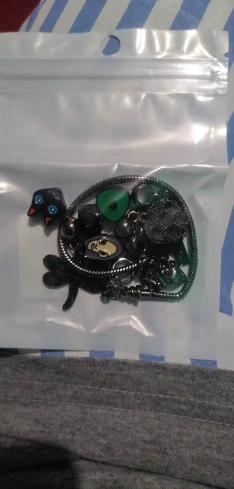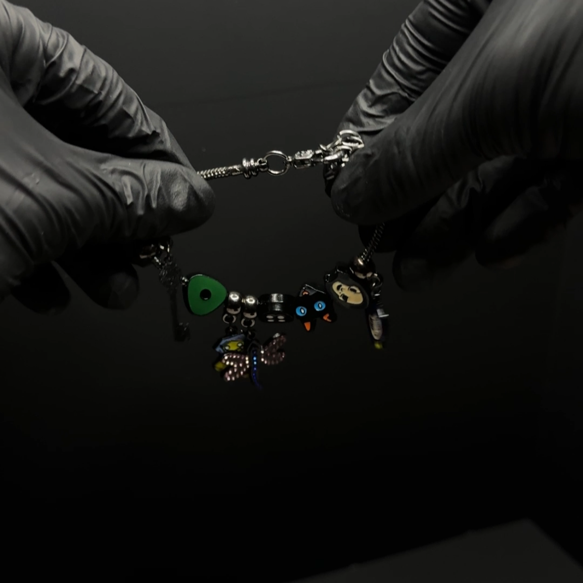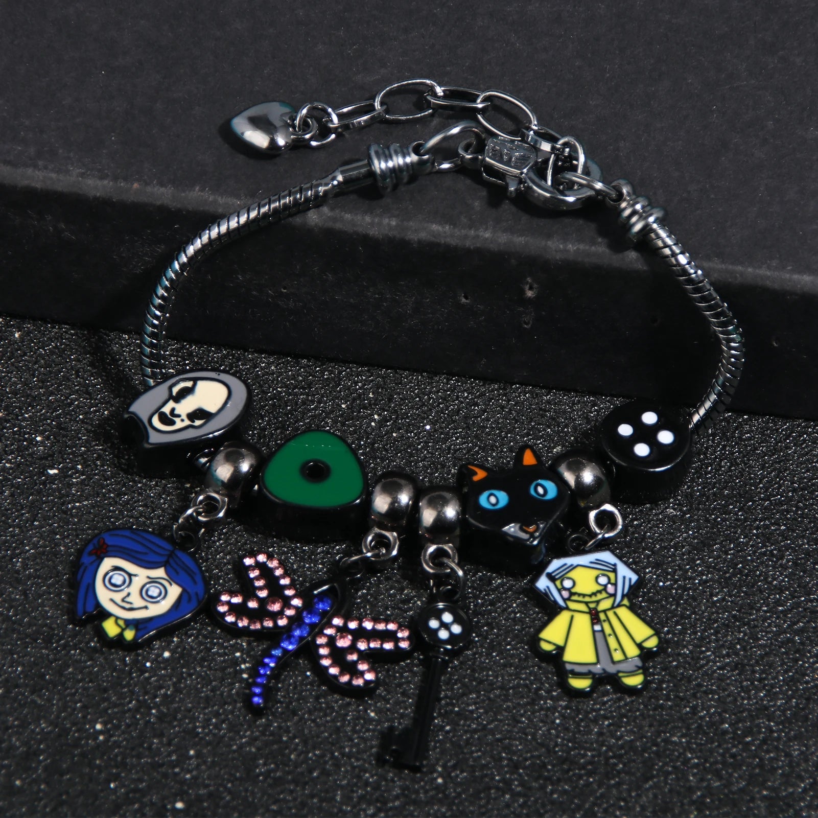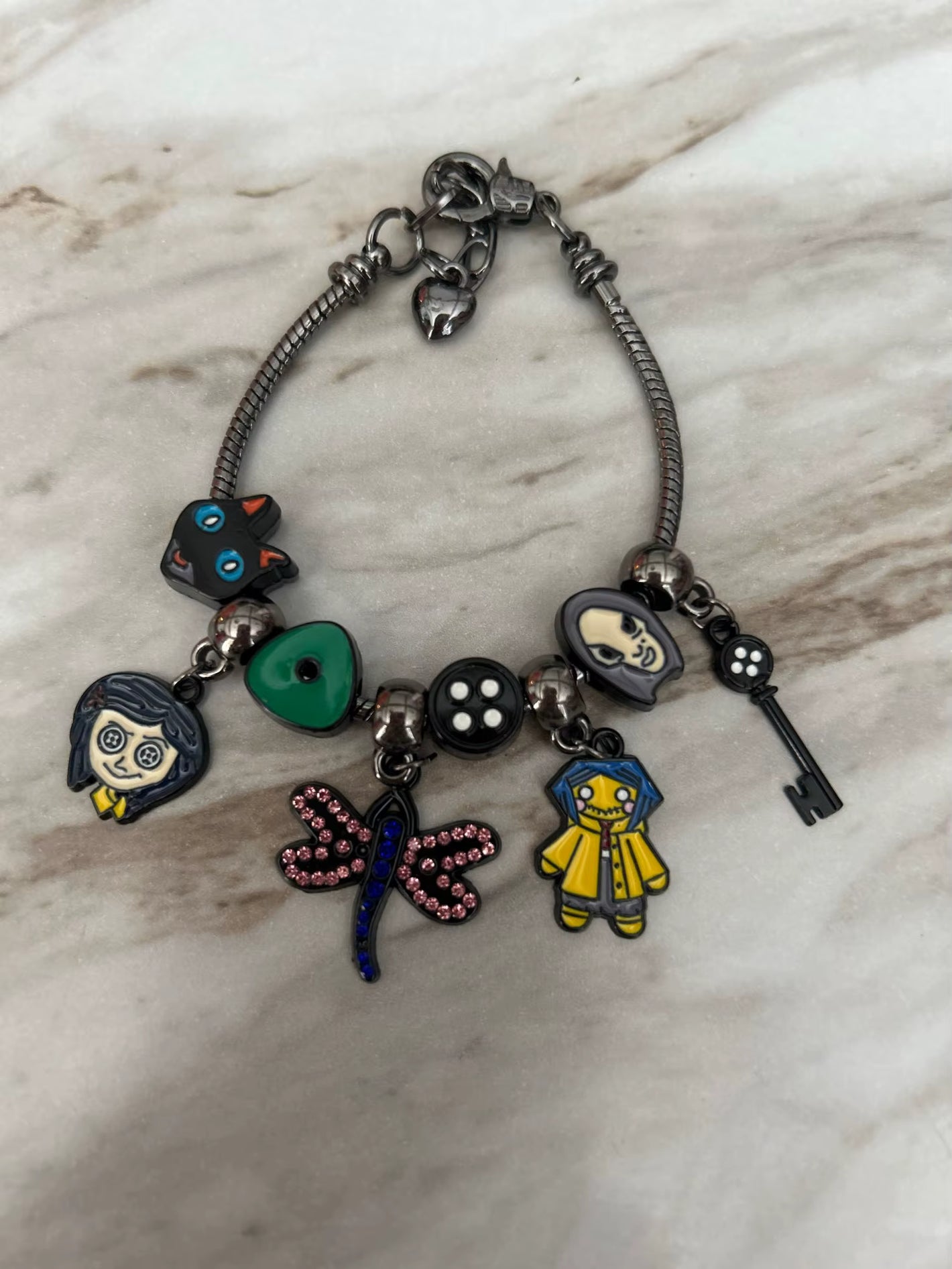 Unlock the mystery behind the button eyes. This Coraline-Inspired charm bracelet brings a touch of eerie elegance to your look, handcrafted with detail that whispers curiosity and wonder. Whether you're drawn to the strange or simply love a good story, this peace is your key to the unknown.